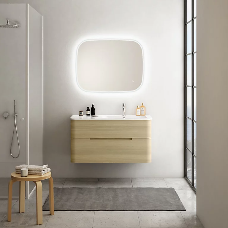 Ensemble salle de bains L. 104 cm meuble sous vasque décor bois natuel + plan vasque à droite blanc brillant Alba