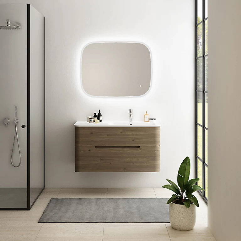 Ensemble salle de bains L. 104 cm meuble sous vasque décor noyer + plan vasque à droite blanc mat Alba