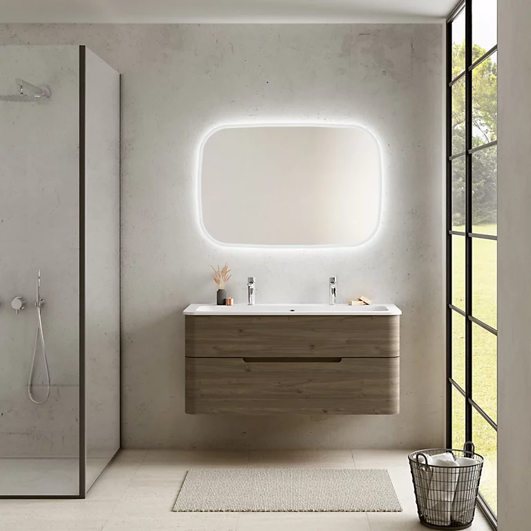 Ensemble salle de bains L. 119 cm meuble sous vasque décor noyer + plan vasque blanc brillant Alba