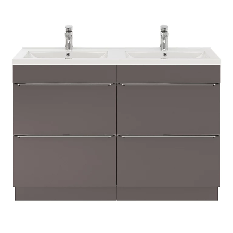 Ensemble salle de bains L.120 cm meuble à poser Imandra gris taupe brillant + plan double vasque céramique blanc