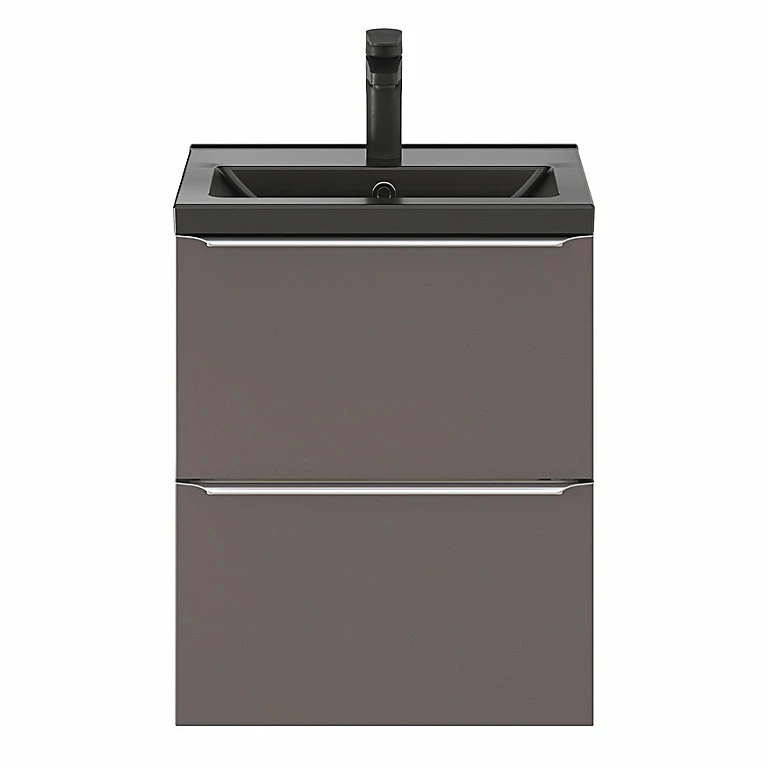 Ensemble salle de bains L.50 cm meuble à suspendre faible profondeur Imandra gris taupe brillant + plan vasque Nira céramique noir