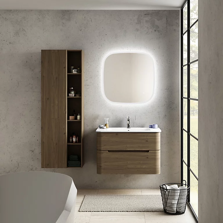 Ensemble salle de bains L. 84 cm meuble sous vasque décor noyer + plan vasque blanc mat Alba