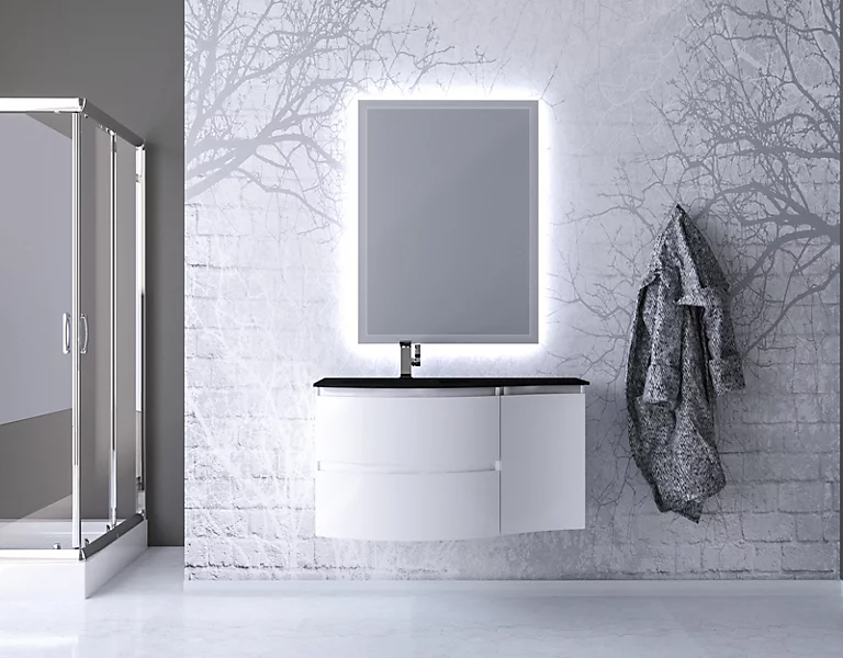 Ensemble Vague L.104 cm meuble sous vasque à suspendre blanc brillant + complément droit + plan vasque verre noir mat