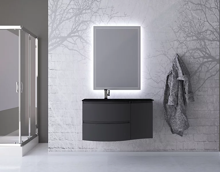 Ensemble Vague L.104 cm meuble sous vasque à suspendre gris anthracite brillant + complément droit + plan vasque verre noir mat