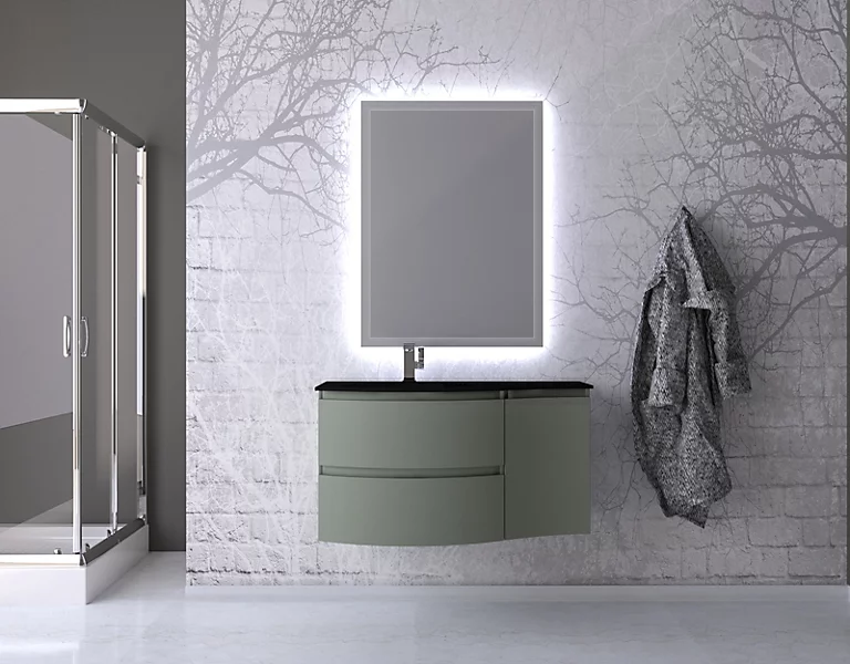 Ensemble Vague L.104 cm meuble sous vasque à suspendre kaki mat + complément droit + plan vasque verre noir mat