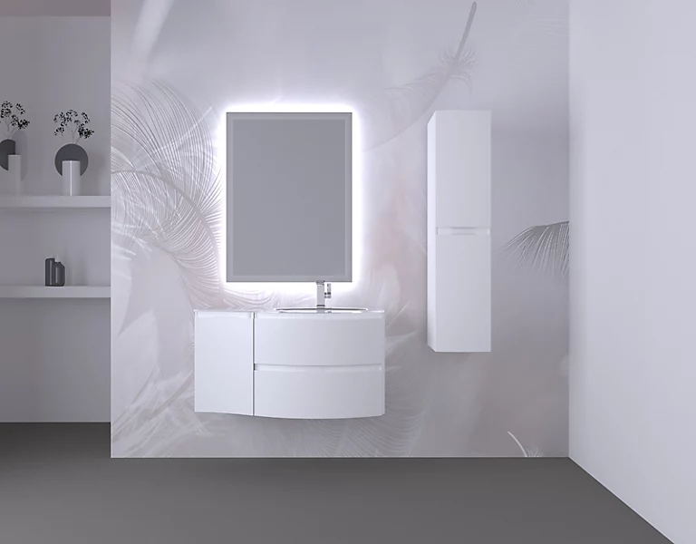 Ensemble Vague L.104 cm meuble sous vasque blanc mat à suspendre + complément gauche + plan vasque verre blanc