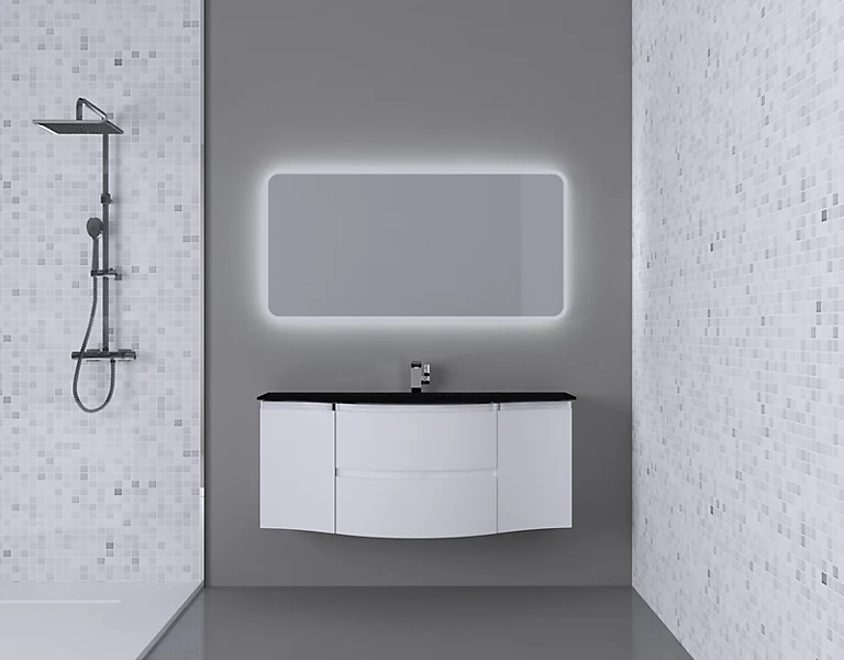 Ensemble Vague L.138 cm meuble sous vasque à suspendre blanc mat + plan vasque central verre noir mat