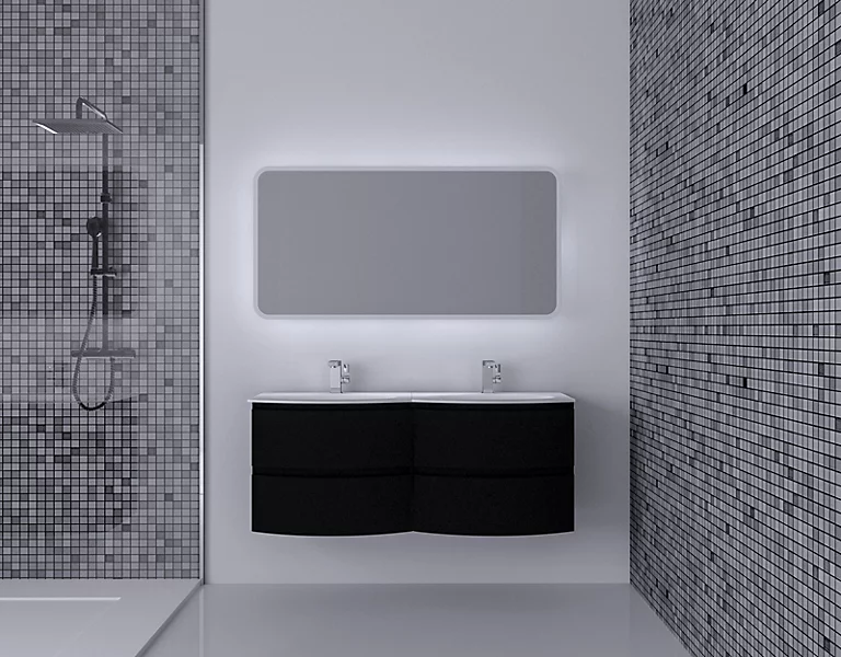 Ensemble Vague L.138 cm meuble sous vasque à suspendre noir mat + plan double vasque résine blanc