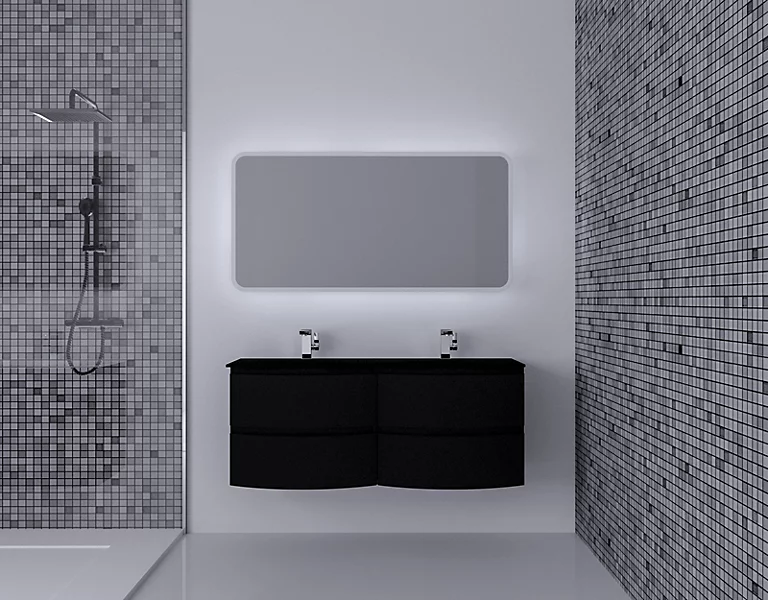 Ensemble Vague L.138 cm meuble sous vasque à suspendre noir mat + plan double vasque verre noir mat