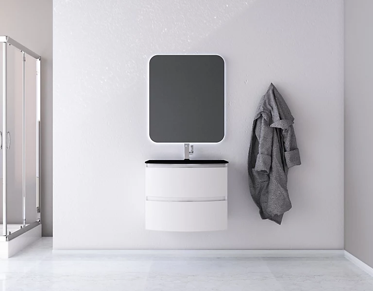 Ensemble Vague L.70 cm meuble sous vasque blanc mat à suspendre + plan vasque verre noir mat