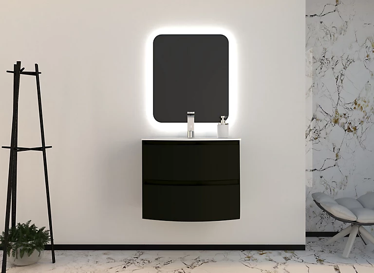 Ensemble Vague L.70 cm meuble sous vasque noir mat à suspendre + plan vasque résine blanc
