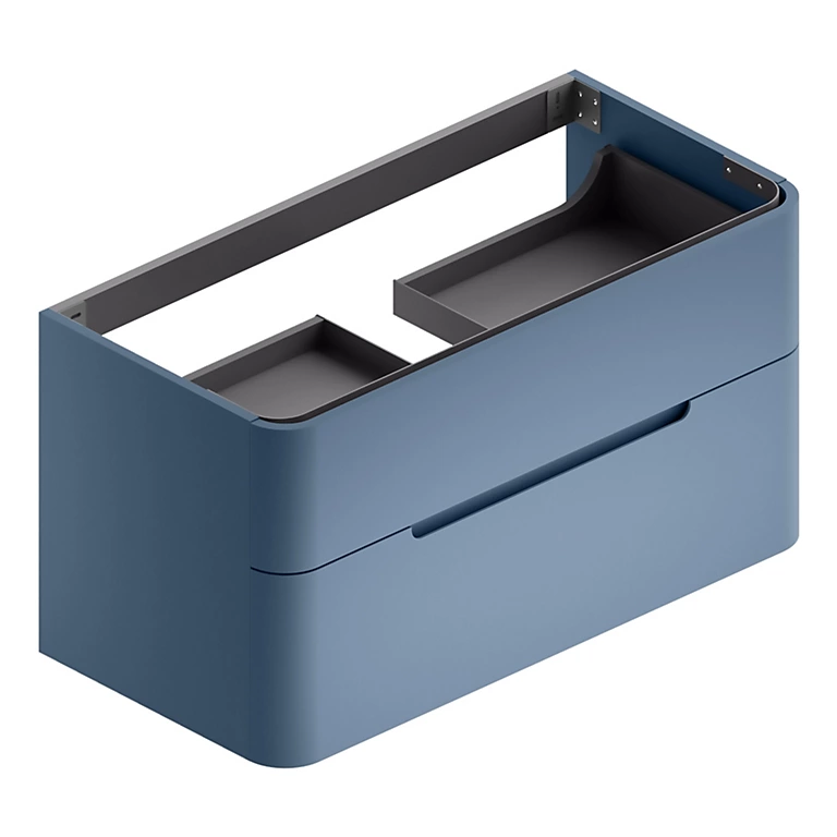Meuble sous vasque design coloris bleu adapté pour une vasque centrale. Deux larges tiroirs à ouverture totale et freins de fermeture assurent un grand espace de rangement.