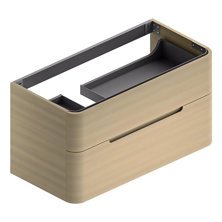 Meuble sous vasque design décor chêne adapté pour une vasque à gauche. Deux larges tiroirs à ouverture totale et freins de fermeture assurent un grand espace de rangement.
