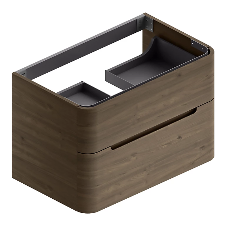 Meuble sous vasque design décor noyer adapté pour une vasque centrale. Deux larges tiroirs à ouverture totale et freins de fermeture assurent un grand espace de rangement.