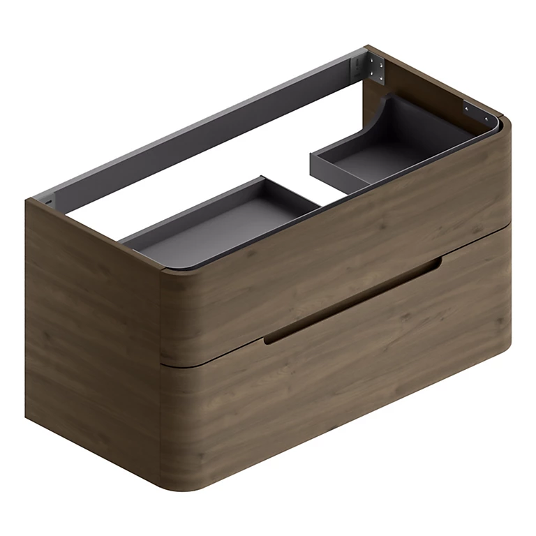 Meuble sous vasque design décor noyer adapté pour une vasque à droite. Deux larges tiroirs à ouverture totale et freins de fermeture assurent un grand espace de rangement.