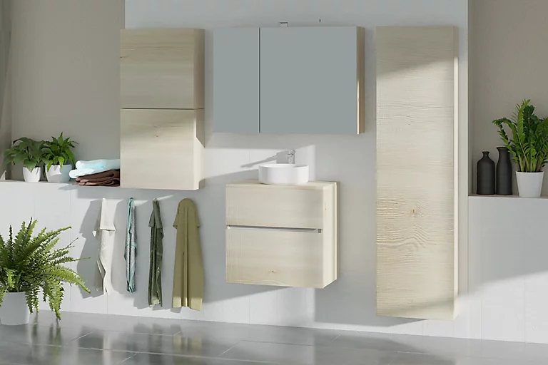 Meuble sous-vasque à suspendre Calao aspect chêne naturel 60 cm + plan de toilette