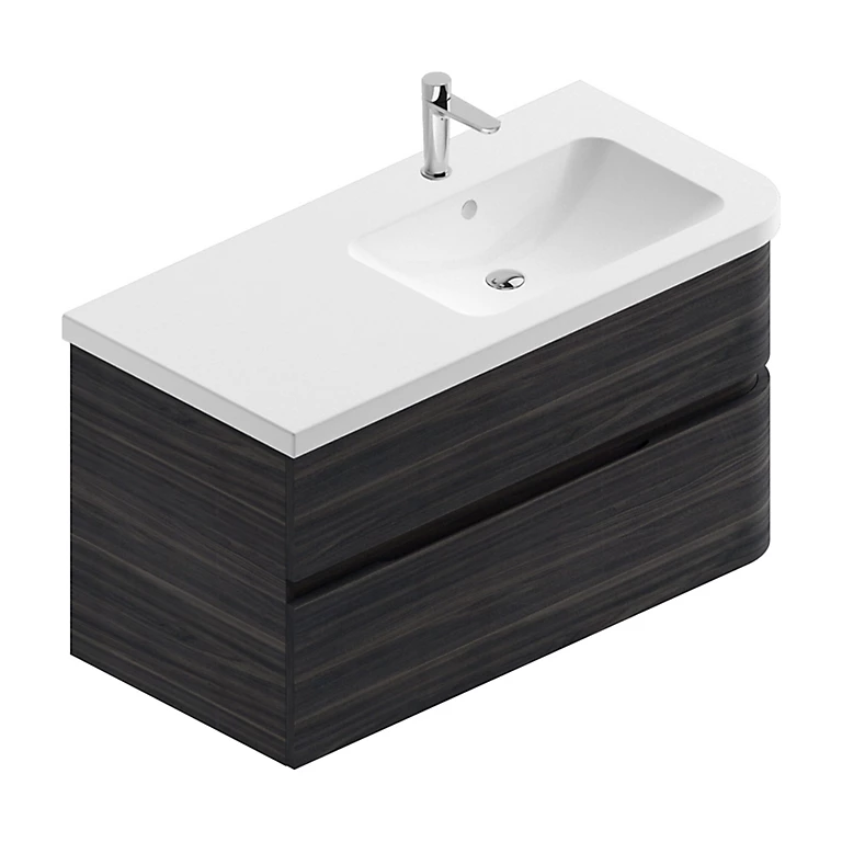 Meuble sous vasque à suspendre Cooke & Lewis Voluto aspect noyer foncé 108 cm + plan vasque en résine blanc version droite