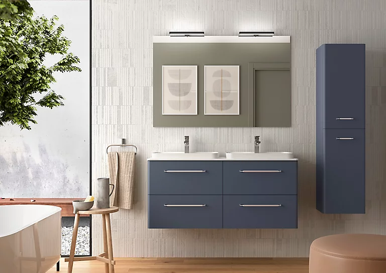 Meuble sous vasque à suspendre Cygnus bath Teha L. 120 cm bleu nuit + plan double vasque semi-encastré résine blanc
