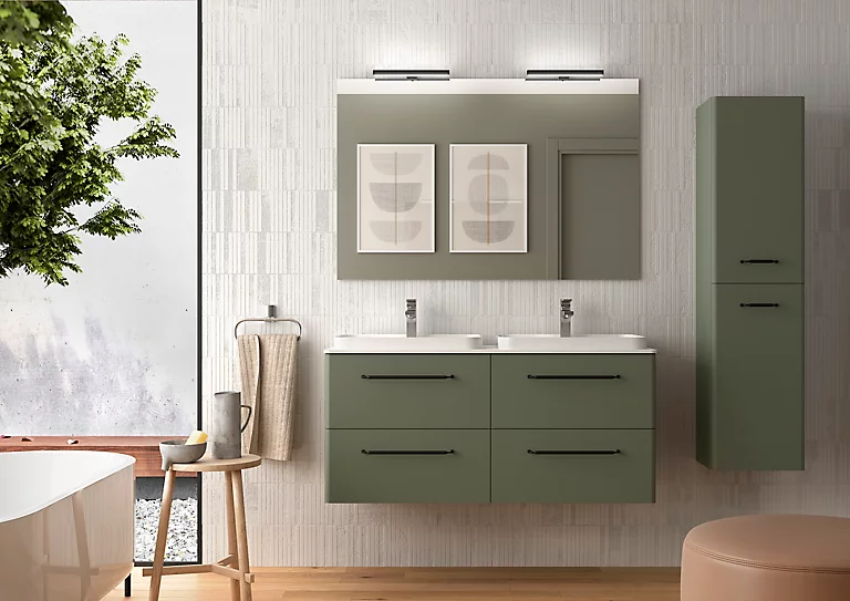 Meuble sous vasque à suspendre Cygnus bath Teha L. 120 cm vert bosque + plan double vasque semi-encastré résine blanc