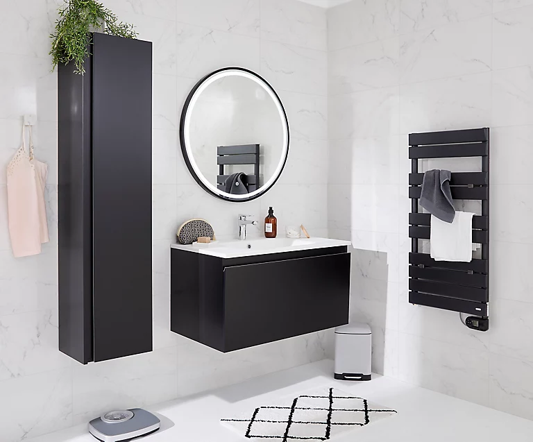 Meuble sous vasque à suspendre Pura noir 90 cm + plan vasque en résine blanc mat