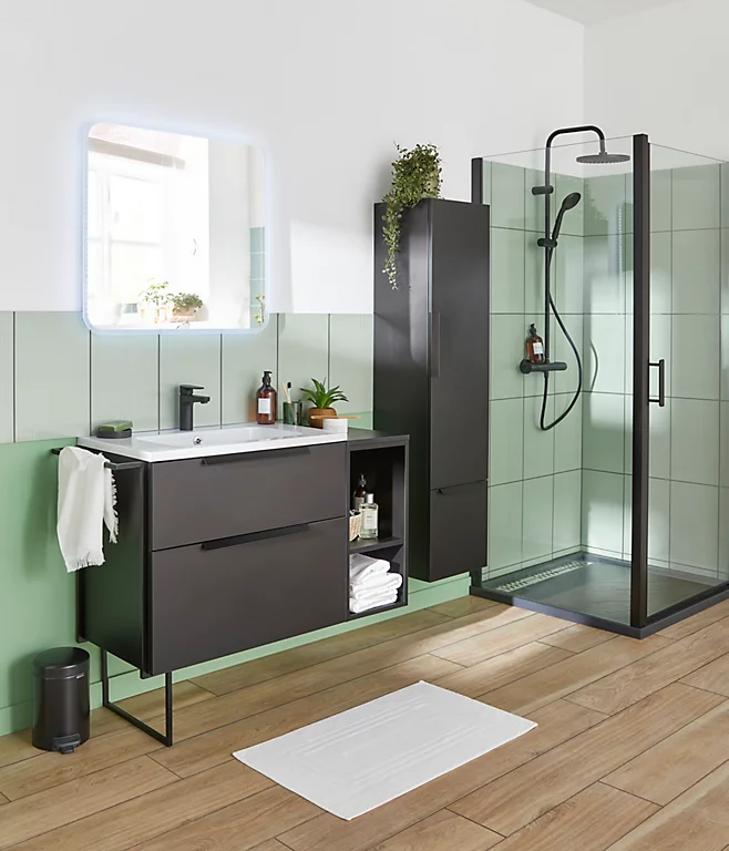 Laissez-vous séduire par ce meuble noir mat ainsi que la vasque blanche en résine, cet ensemble résolument moderne métamorphosera votre salle de bains !