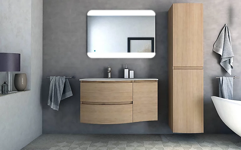 Meuble sous vasque à suspendre Vague décor chêne naturel 104 cm + plan vasque en verre blanc + meuble complément droite
