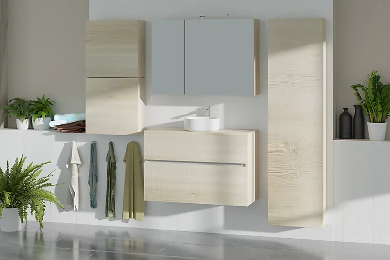 Meuble sous-vasque faible profondeur à suspendre Calao aspect chêne naturel 90 cm + plan de toilette