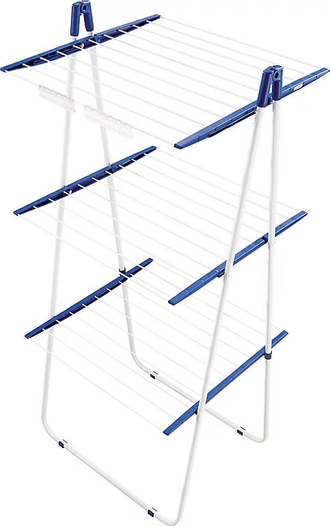 Vous avez peu de place pour faire sécher votre linge ? Avec le séchoir tour Pegasus Tower 190, tout est enfin possible ! Avec une surface au sol de seulement 66 x 61 cm, il s’intègre parfaitement dans une cabine de douche par exemple ou également sur un petit balcon. Les trois niveaux de séchage assurent une capacité d’étendage de 19 mètres. Pour les grandes pièces de linge, il est possible de rabattre le niveau du milieu. La hauteur s’élève à 1,50 m.