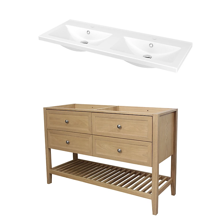 Meuble sous vasque à poser 4 tiroirs GoodHome Perma bois 120 cm + Plan double vasque céramique blanc GoodHome Nira